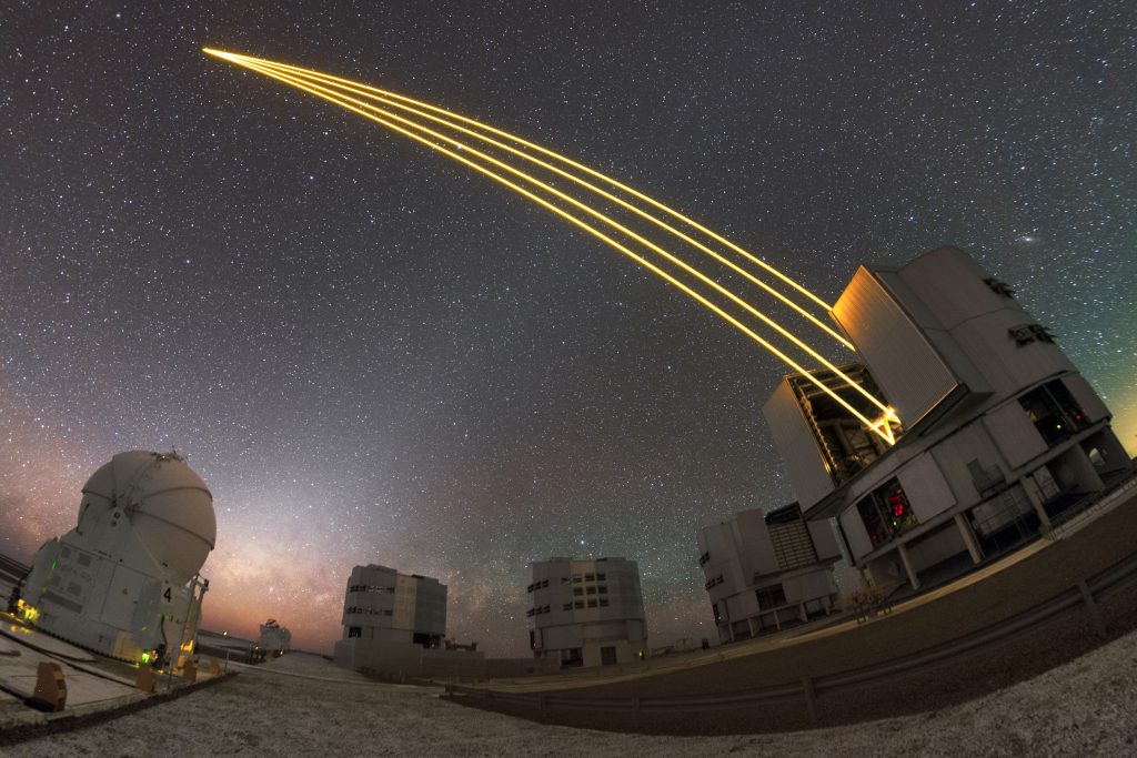Main image: One of the Unit Telescopes of ESO’s Very Large Telescope (VLT) is producing artificial stars in the skies above the Atacama Desert Crédit: ESO/P. Horálek