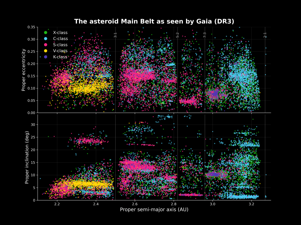 Main image: The figures illustrate the structure of the main asteroid belt revealed by Gaia DR3 spectroscopic data, where each asteroid is coloured according to their spectral type. The collisional families resulting from past impacts are highlighted, as well as a clear radial structure: S-type asteroids that are linked to more processed types of meteorites (e.g. ordinary chondrites) dominate the inner belt, while C-type asteroids that are linked to dark, primitive, water and organic-rich carbonaceous meteorites are more common in the outer belt. The main orbital resonances with Jupiter are indicated, illustrating their key role in shaping the dynamical architecture of the belt. Credit ‘ESO/R. West’
